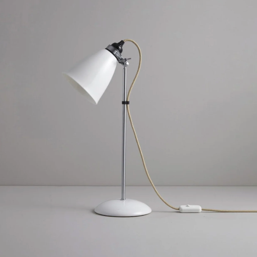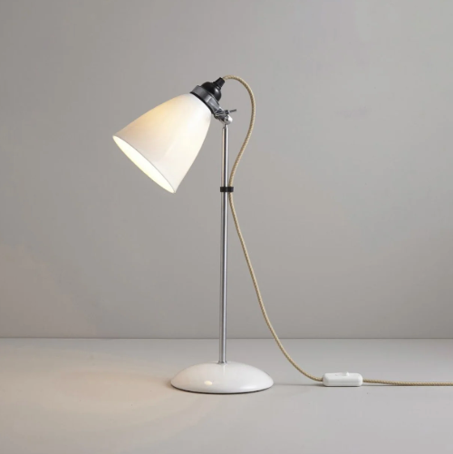 A British design classic in translucent bone china. With its moveable shade and taupe cotton braided flexible cord, the Hector table light provides a soft, ambient light and is a popular style. A perfect desk or bedside table piece.