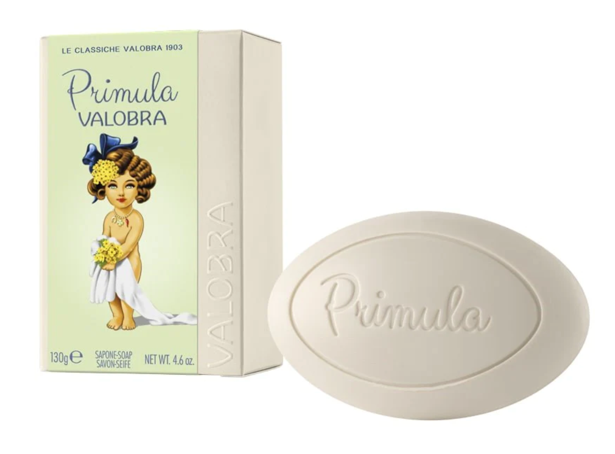 PRIMULA - Valobra's classic Primula soap is a super-fatted, extremely gentle soap, suitable for sensitive skin, even infants. Its Rice Oil cream and blend of vitamins gently cleanse and soften the skin while its refined, delicate fragrance, containing Primrose petals and aromatic Lavender and Geranium, recreates olfactory harmony, depicting a nature that is pure.