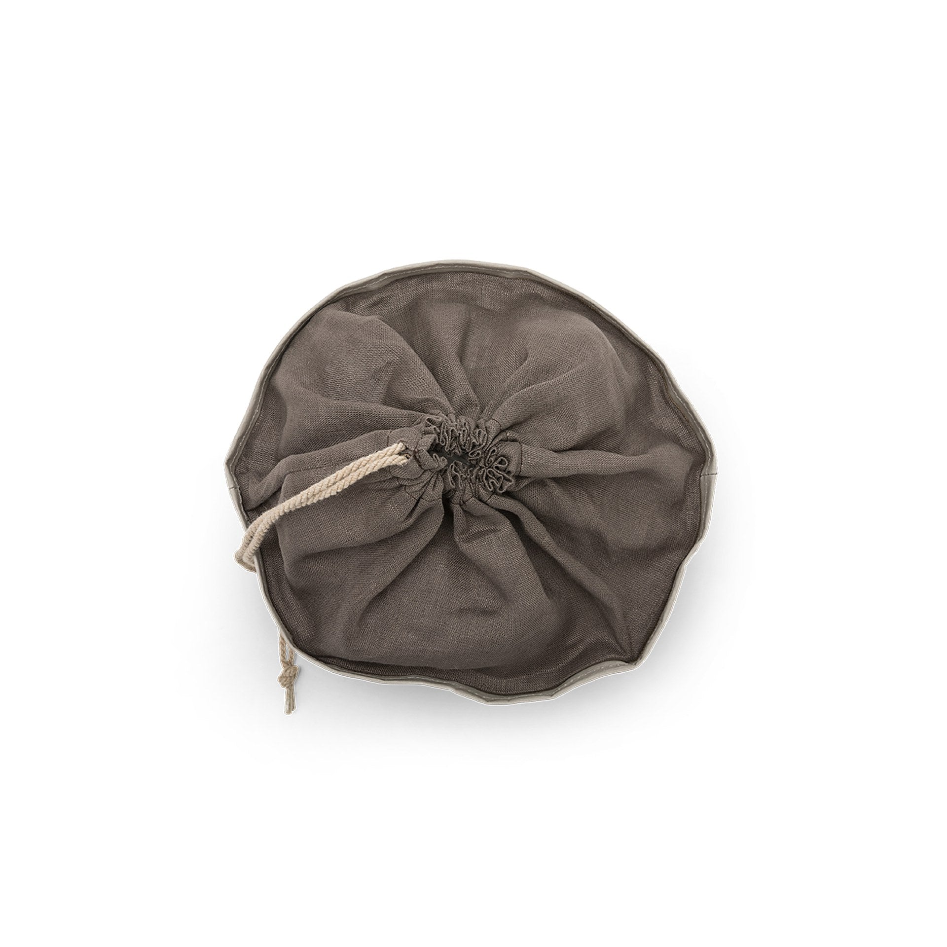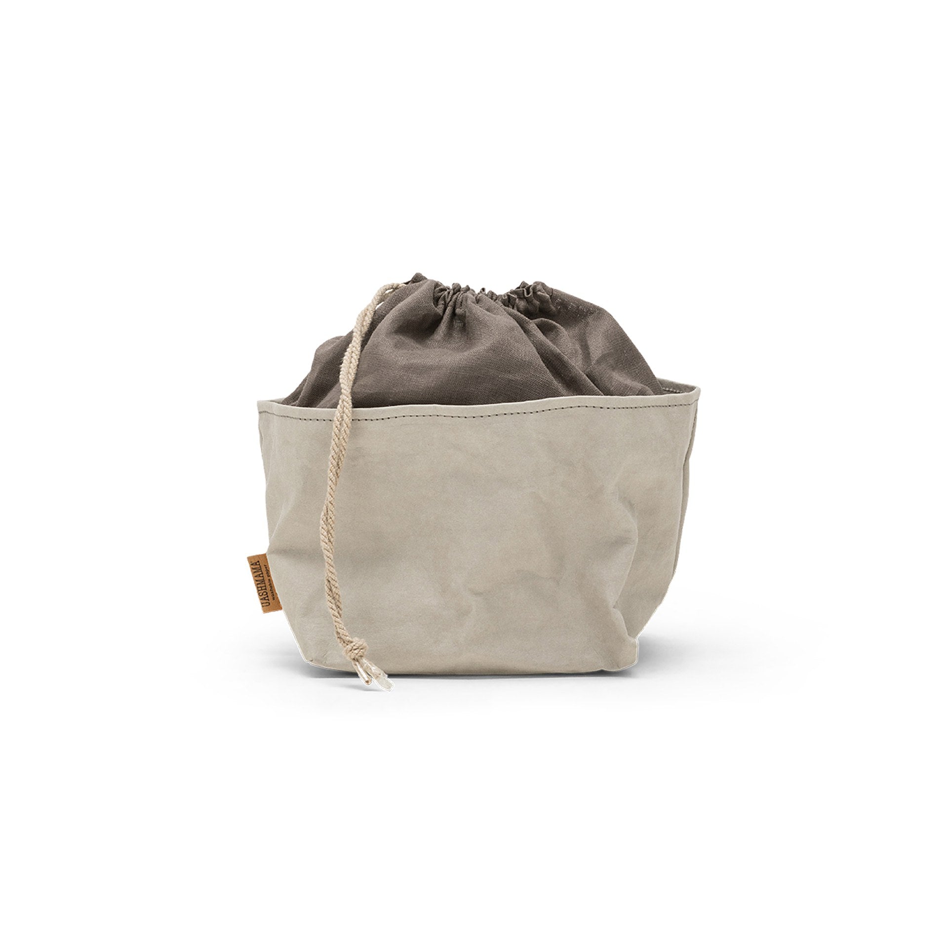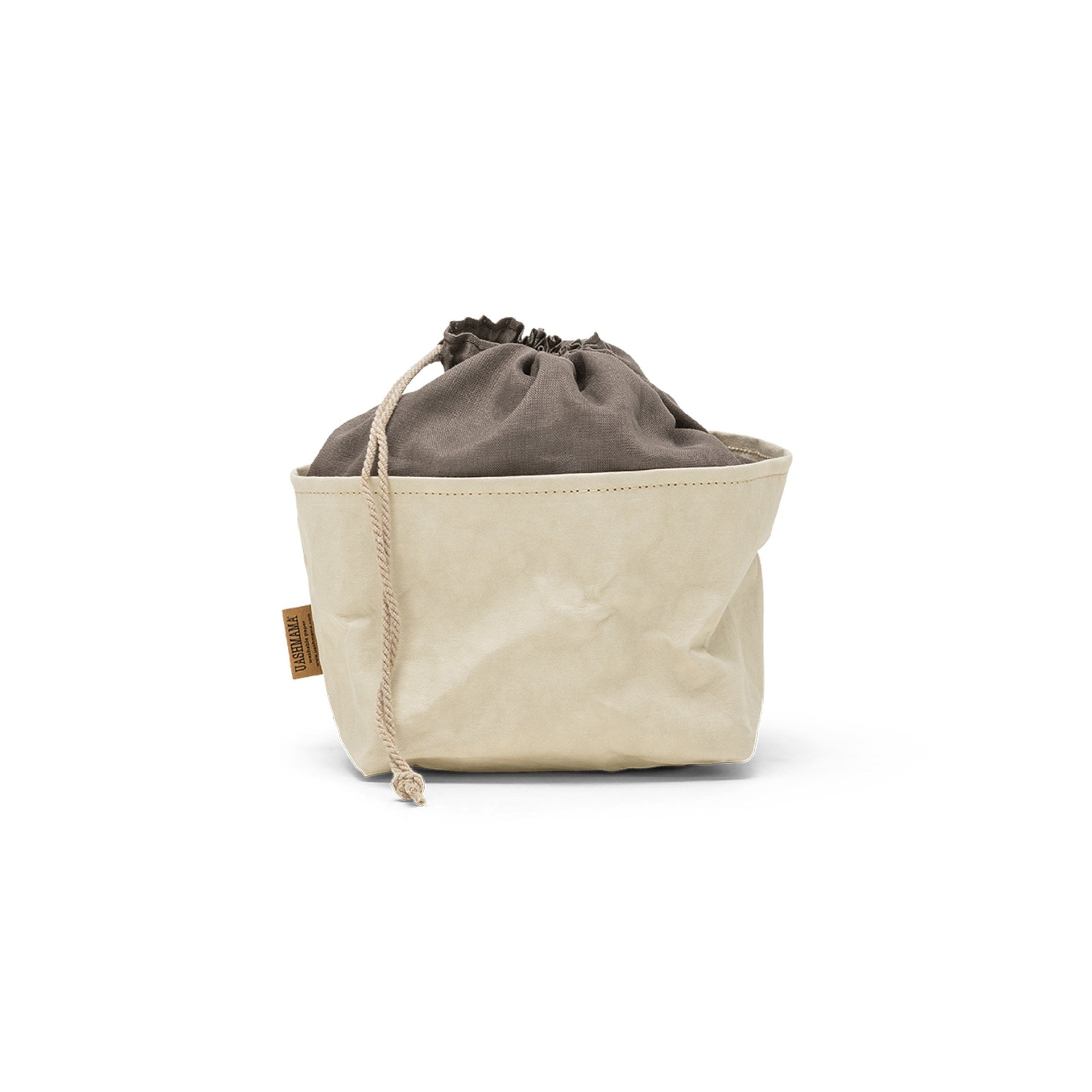 A washable paper bag with a linen drawstring top to keep your loaves of bread, croissants, and cookies safe and warm. Easy to clean with a wet cloth using warm water and mild soap, let air dry.