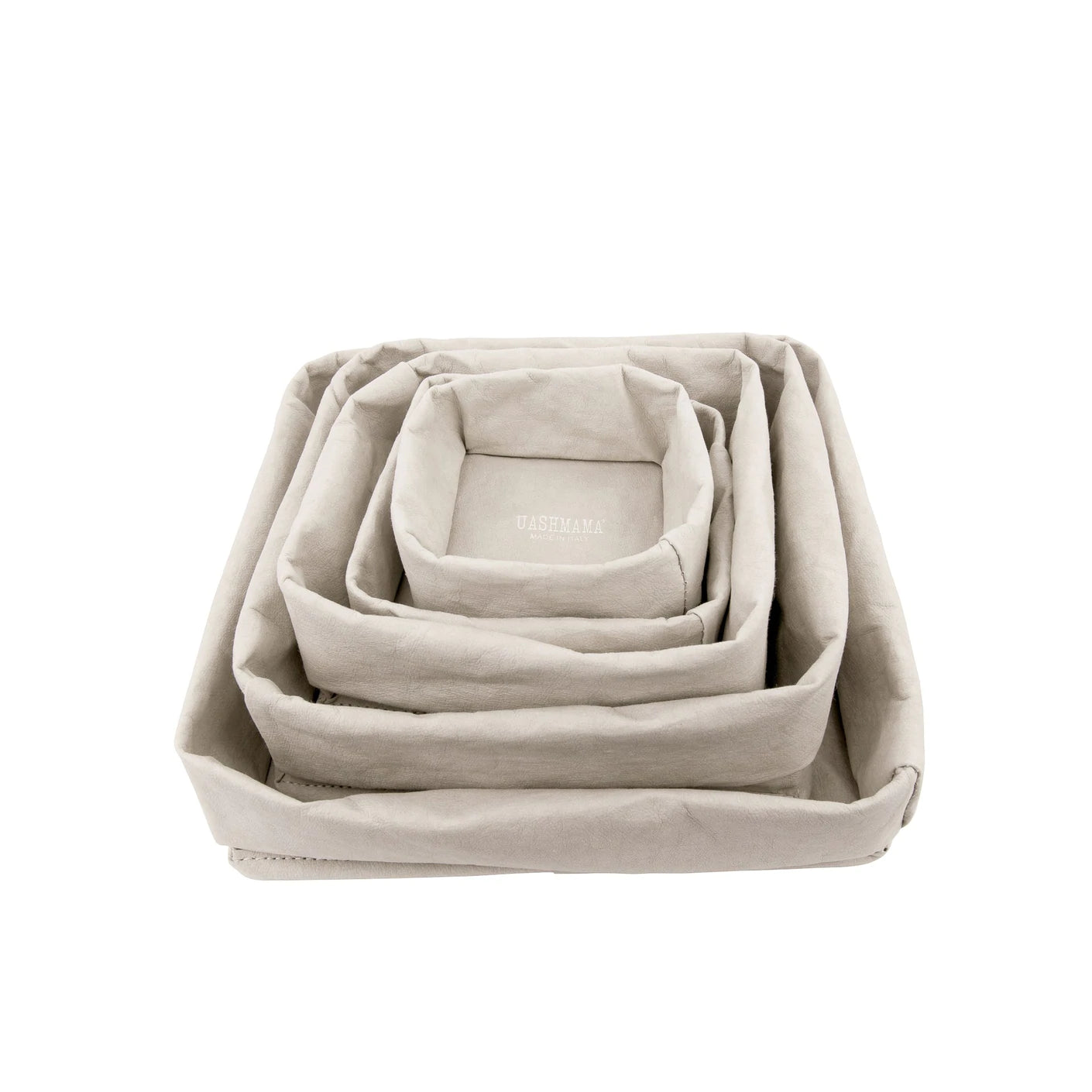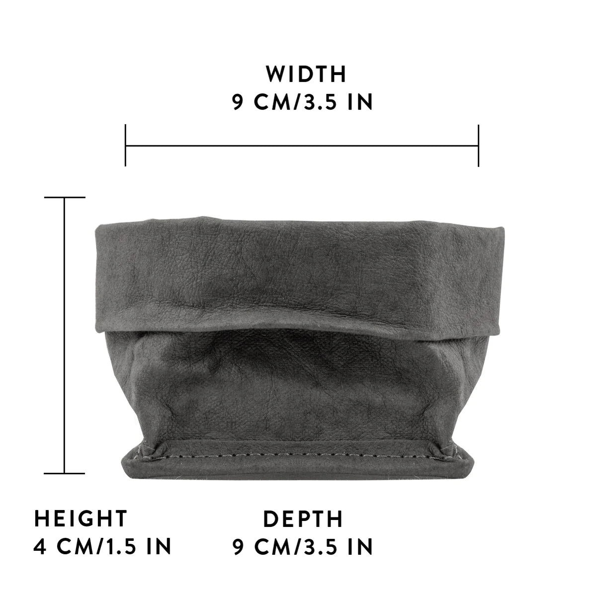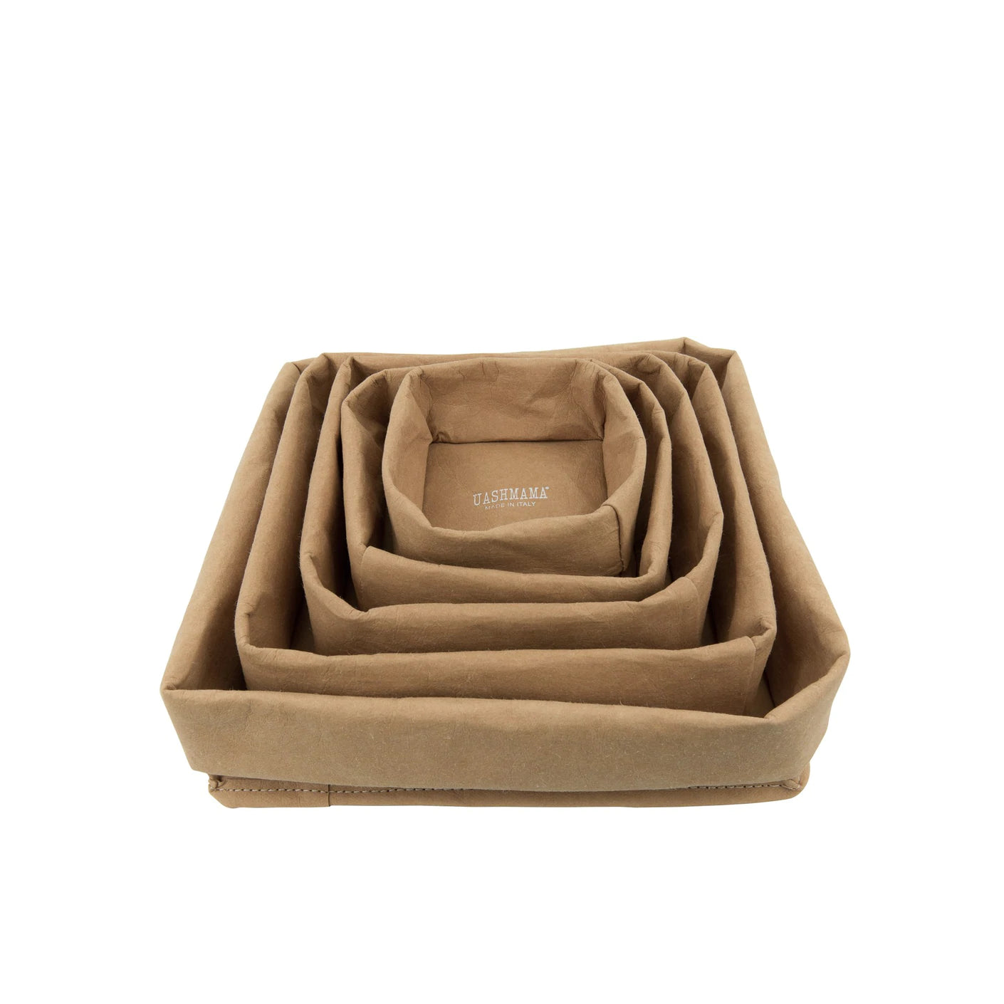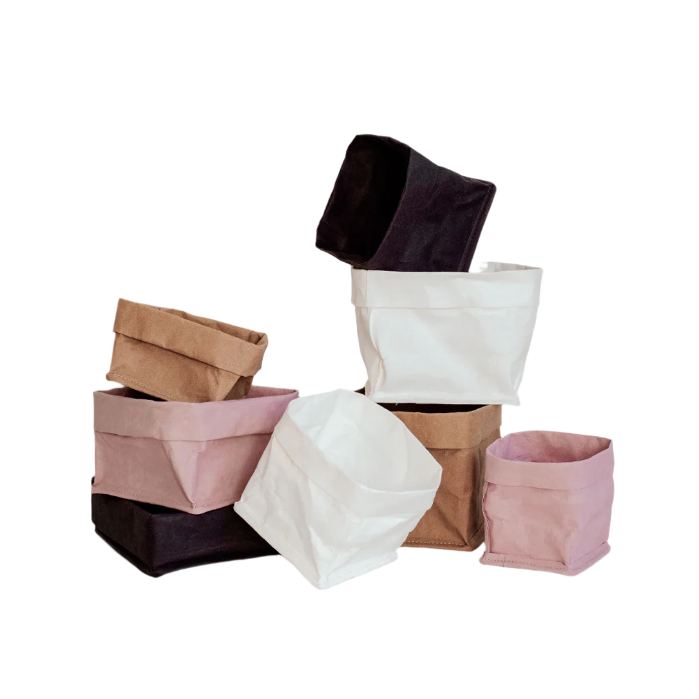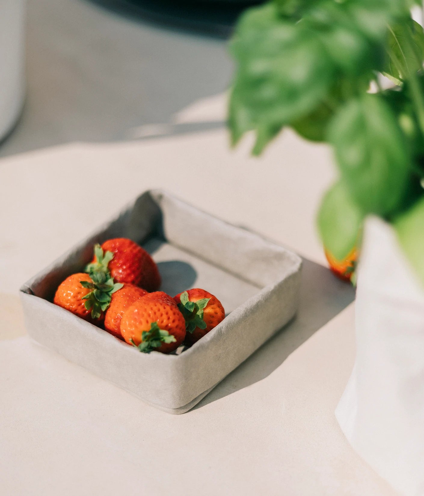 The shape of this box tray has more form than roll, but the mechanics are the same of the paper bags, roll up for a box or down for a tray. They look great anywhere with everything, use for jewelry, salt and pepper, makeup, keys, dry fruit...