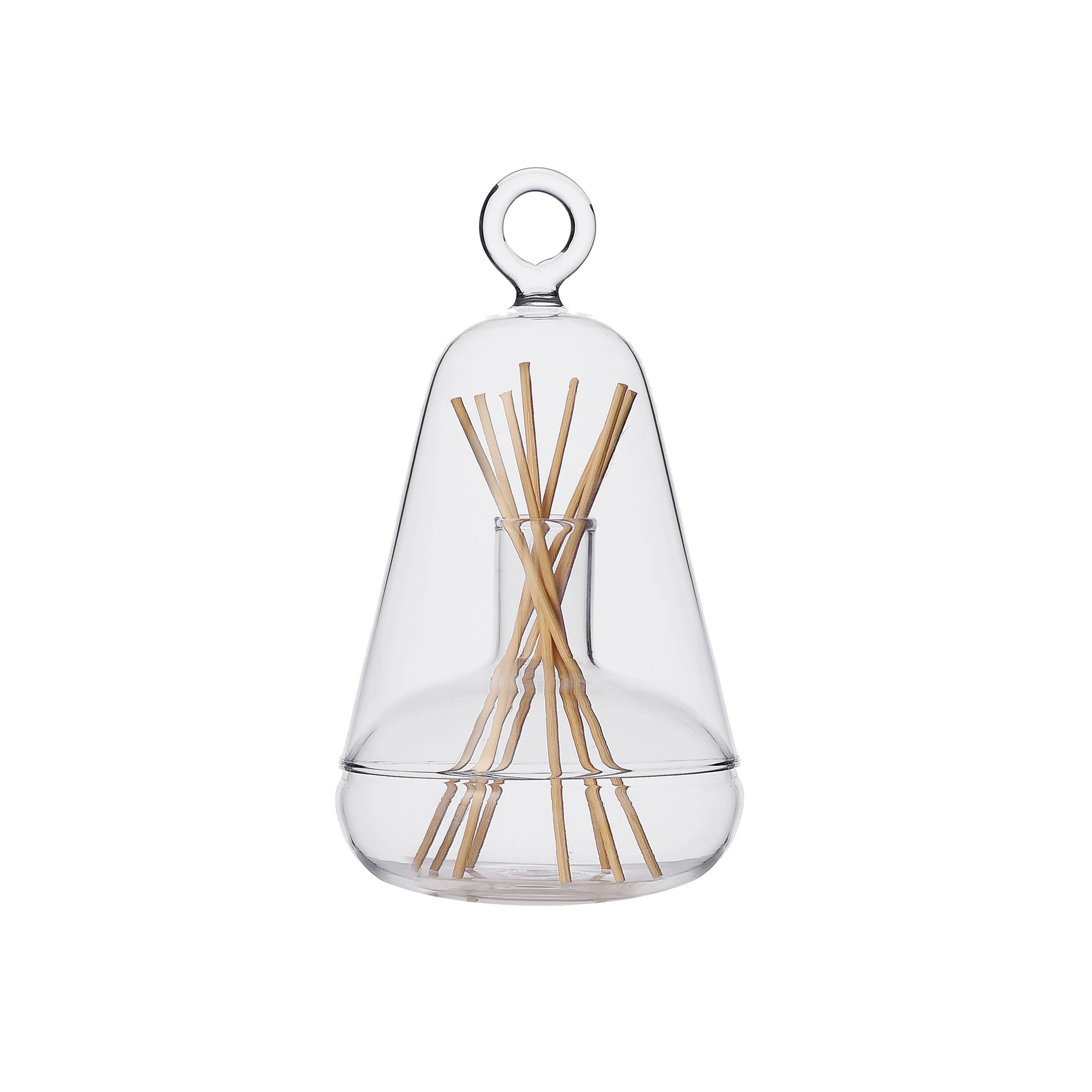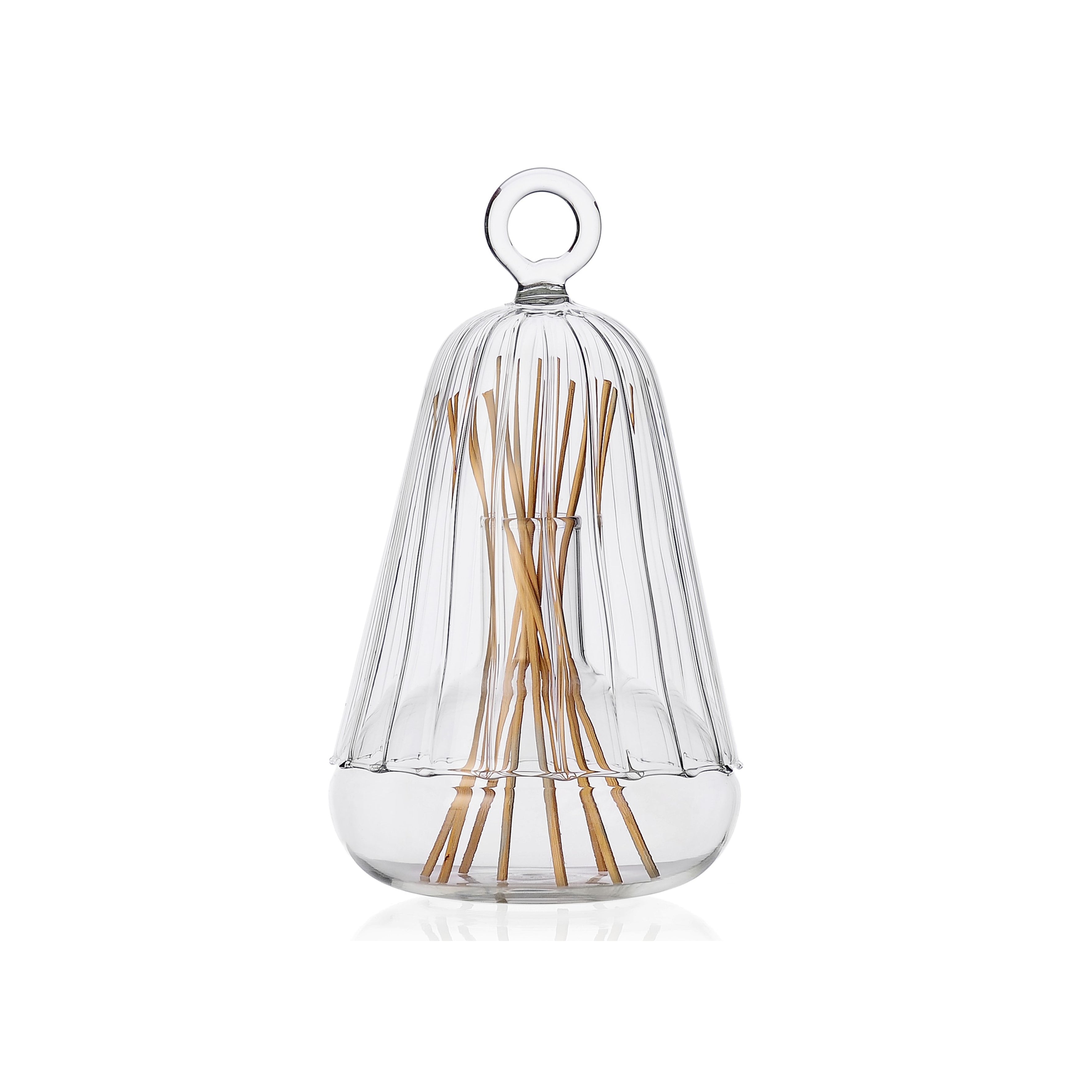 The Bell cloche diffuser elevates your ambient home fragrance experience.  A bell-shaped lid is placed over the diffuser to control the ambient fragrance. Remove the bell cloche lid to allow the fragrance to difuse through the room.  Available in 2 versions: clear and smooth and optical striped.  Diffuser reeds included.  Home fragrance sold separately.