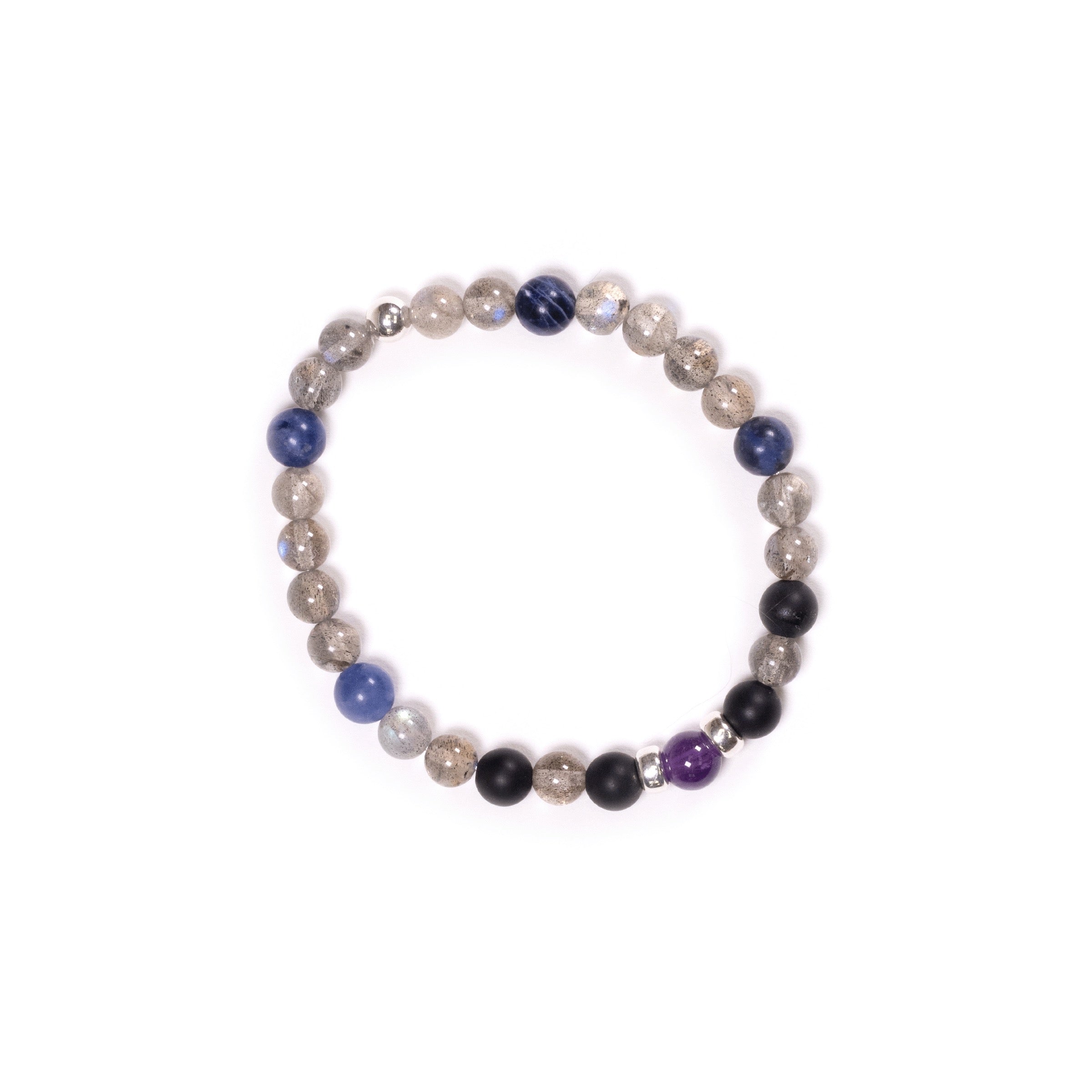 This handcrafted bracelet combines the mystical allure of labradorite and sodalite with complementary amethyst and matte onyx beads in a thoughtfully curated 6mm design. Strung on resilient elastic cord, it slips effortlessly onto the wrist while maintaining its shape. Sterling silver accents elevate the piece with refined elegance. Measuring 6.5 inches, custom sizing is available upon request. Meticulously assembled by hand in the USA, each bracelet showcases the natural variation inherent to gemstone jewelry.