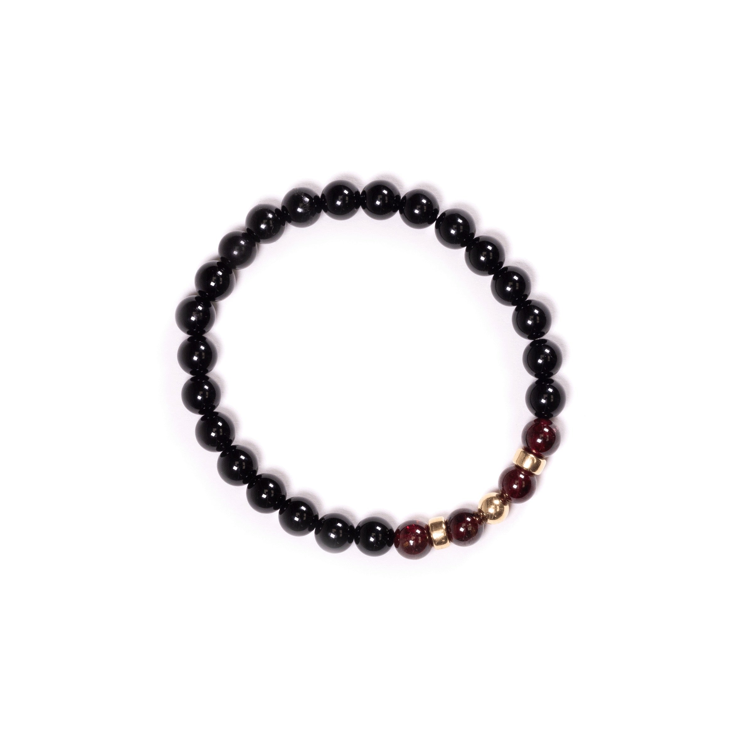 This elegant bracelet features lustrous onyx and deep garnet beads paired with 14k gold-fill accents, all thoughtfully handcrafted in the USA. Strung on resilient elastic cord, it slips effortlessly onto the wrist for everyday wear. The 6mm beads create a refined aesthetic, while the 6.5" length offers a comfortable fit. Custom sizing is available upon request.