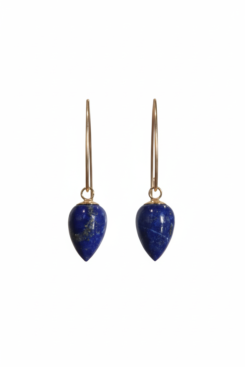 Natural, polished, blue-gold veined lapis lazuli acorn stones hanging from marquis shaped ear wires for day-evening wearability.
