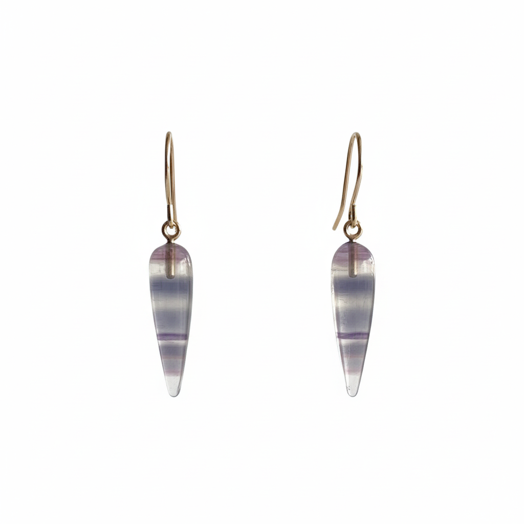 Purple, blue, and grey bands of fluorite accentuate the long spike shape of this edgy, yet casual earring.  Suitable for everyday.