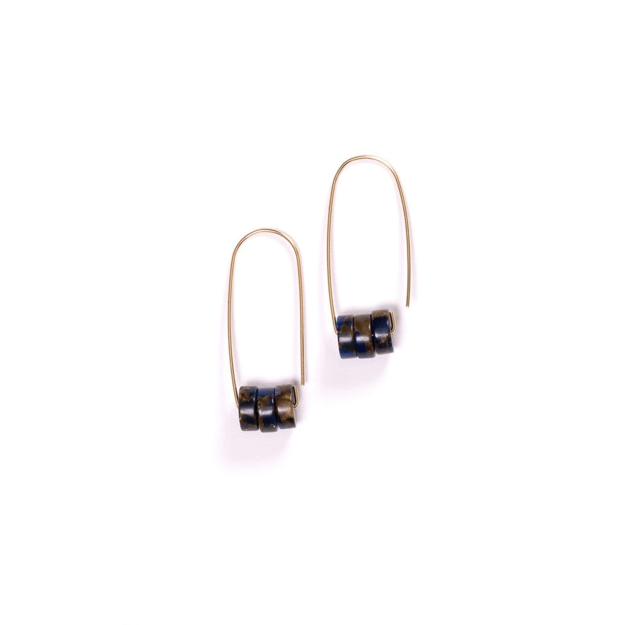 These elegant earrings showcase striking blue river jasper, its natural veins catching light with subtle sophistication. Each stone is carefully suspended on hand-hammered gold-fill wire, creating a refined interplay between the earthy gemstone and lustrous metal. The artisanal wire work adds texture and movement.