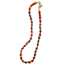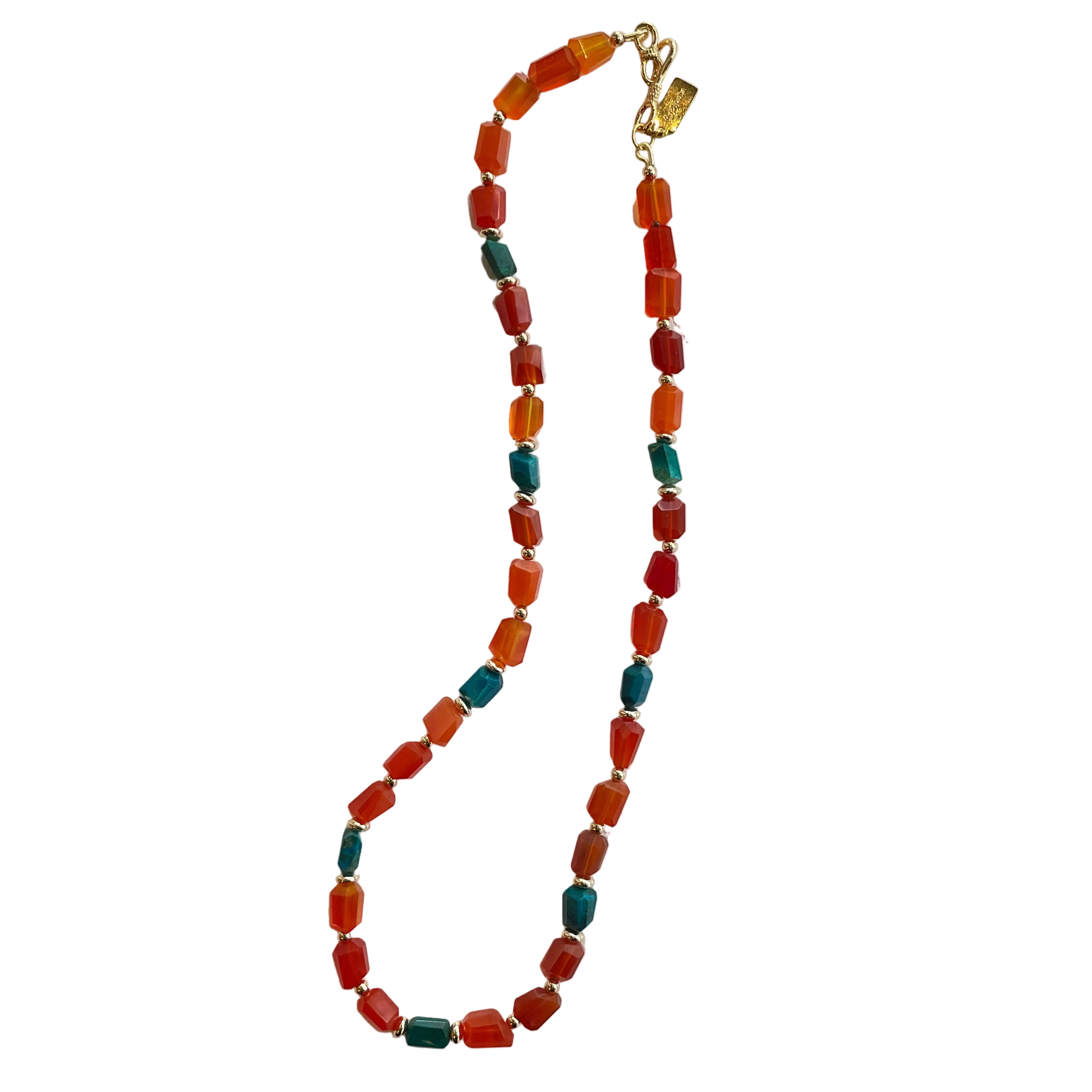 This elegant necklace combines luminous blue-green chrysocolla with warm orange carnelian stones, expertly hand-strung with refined 14k gold-fill accents. The tumbled and faceted gemstones create visual depth and movement, while the matching 14k gold-fill clasp ensures lasting durability. Approximately 17 inches in length, it strikes the perfect balance between statement and versatility.