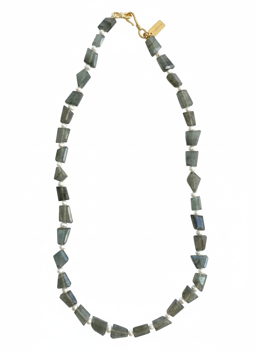 Luminous labradorite stones showcase their signature blue-grey flash, paired with delicate freshwater seed pearls in this refined necklace.