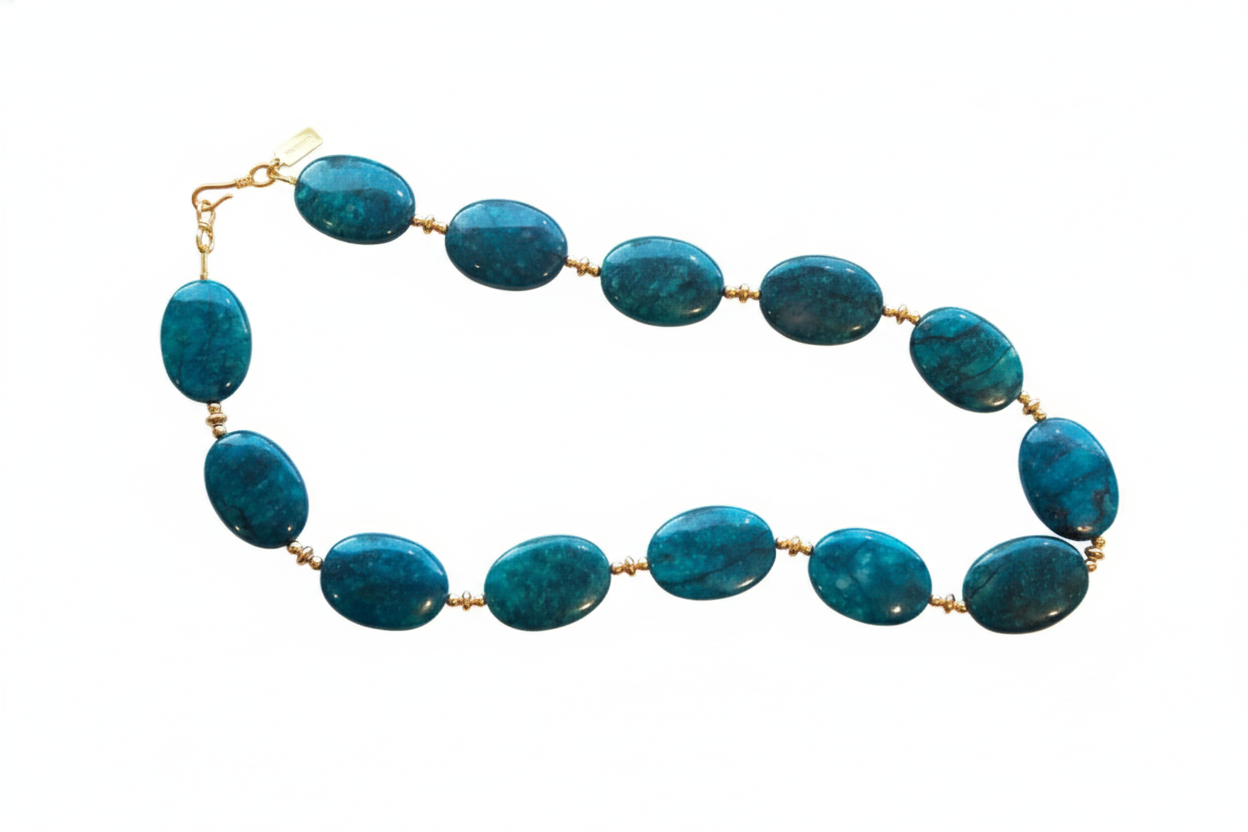 Discover understated elegance with this handcrafted necklace featuring luminous petrol blue apatite stones paired with warm 14k goldfill beads. At 17 inches, it strikes the perfect balance between statement and versatility, draping gracefully at the collarbone. Entirely handmade and one of a kind, ensuring you own a truly unique treasure. The rich blue tones evoke depth and tranquility, while the precious metal accents add timeless sophistication to any ensemble.