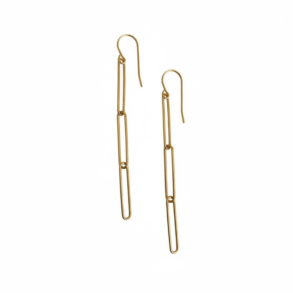 These elongated triple link earrings embody refined elegance with their graceful, extended design. Crafted to complement a discerning aesthetic, the linked structure creates subtle movement and visual interest while maintaining understated sophistication. The elongated silhouette offers a modern take on classic jewelry, making them equally at home in professional settings or evening occasions. A refined addition for those who appreciate quality craftsmanship and timeless design. Sold as a pair.