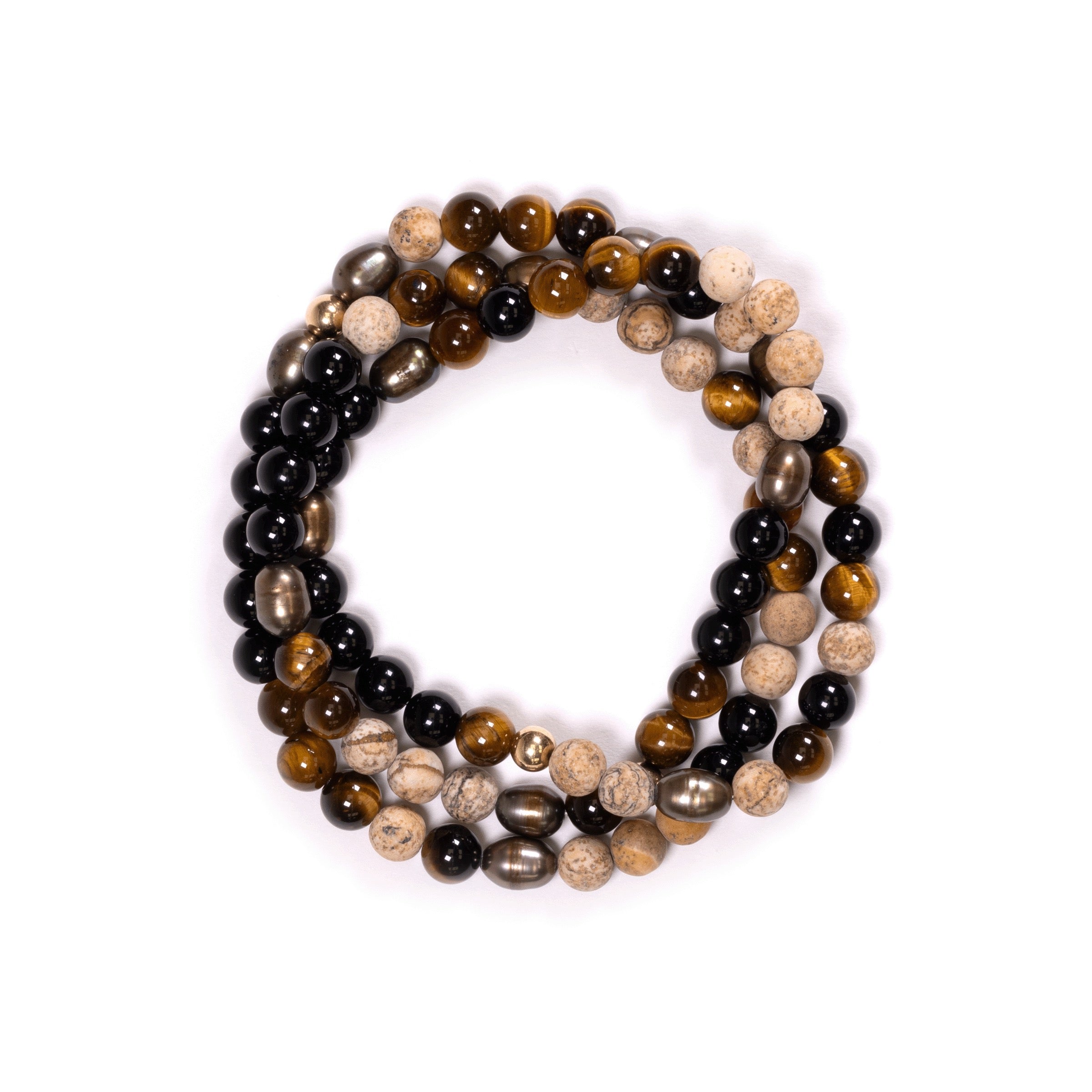 This triple-wrap bracelet combines the grounding energy of tiger's eye, onyx, and matte jasper with lustrous baroque pearls and 14k gold-fill accents. Hand-strung on resilient elastic, it glides effortlessly onto your wrist and circles three times for a layered, elegant look. The versatile design transitions seamlessly from wrist to neckline, extending 20"-22" when worn as a necklace. Each piece features artisan-crafted gold-fill beads made in the USA, creating a sophisticated accessory that balances natural stone beauty with refined metalwork.
