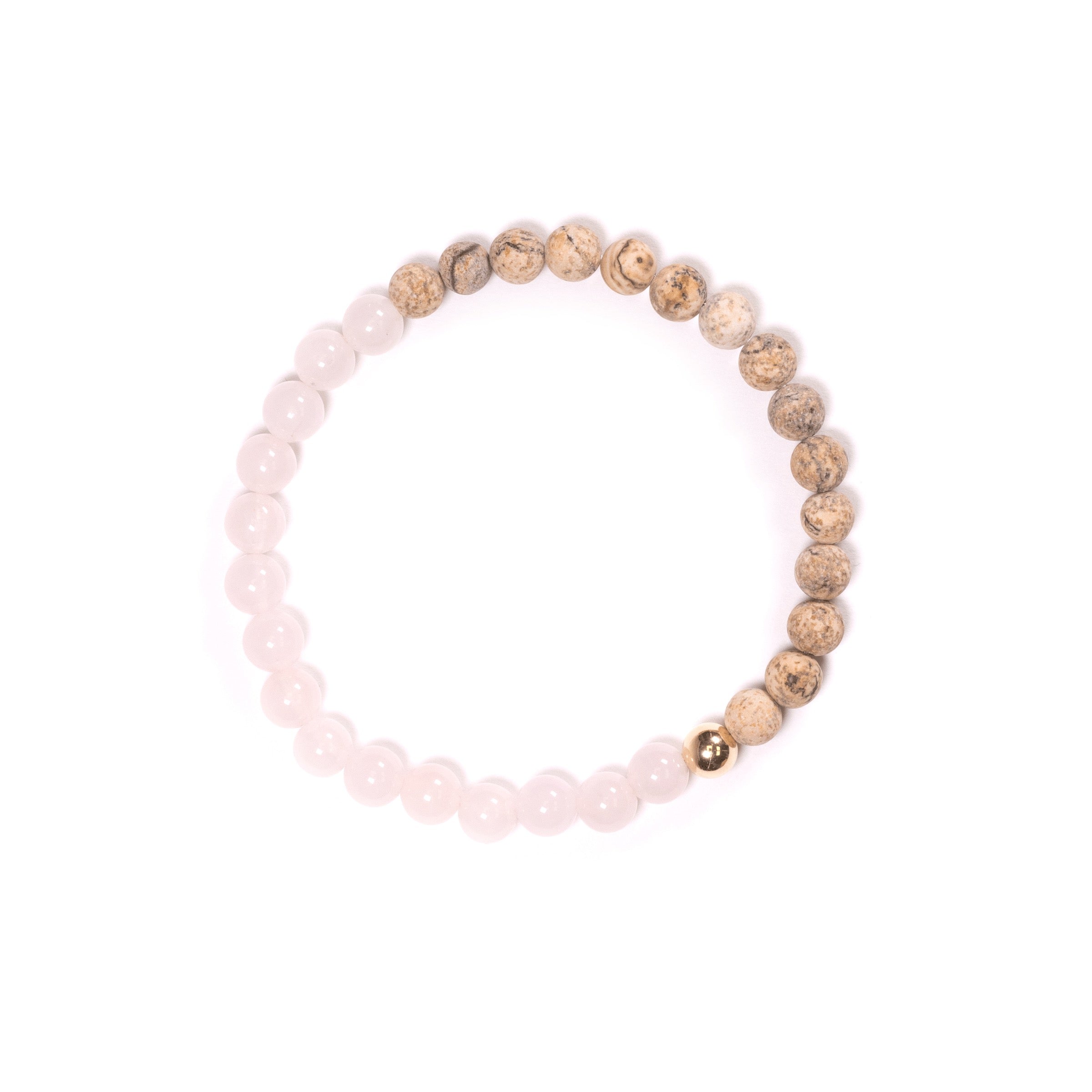 Handcrafted with care, this elegant bracelet features rose quartz and matte jasper beads paired with delicate 14k gold-fill accents. Strung on resilient elastic cord, it slips effortlessly onto the wrist and measures 6.5 inches. Each bead is precisely 6mm, creating a refined aesthetic. Custom sizing is available to ensure a perfect fit for your wrist.
