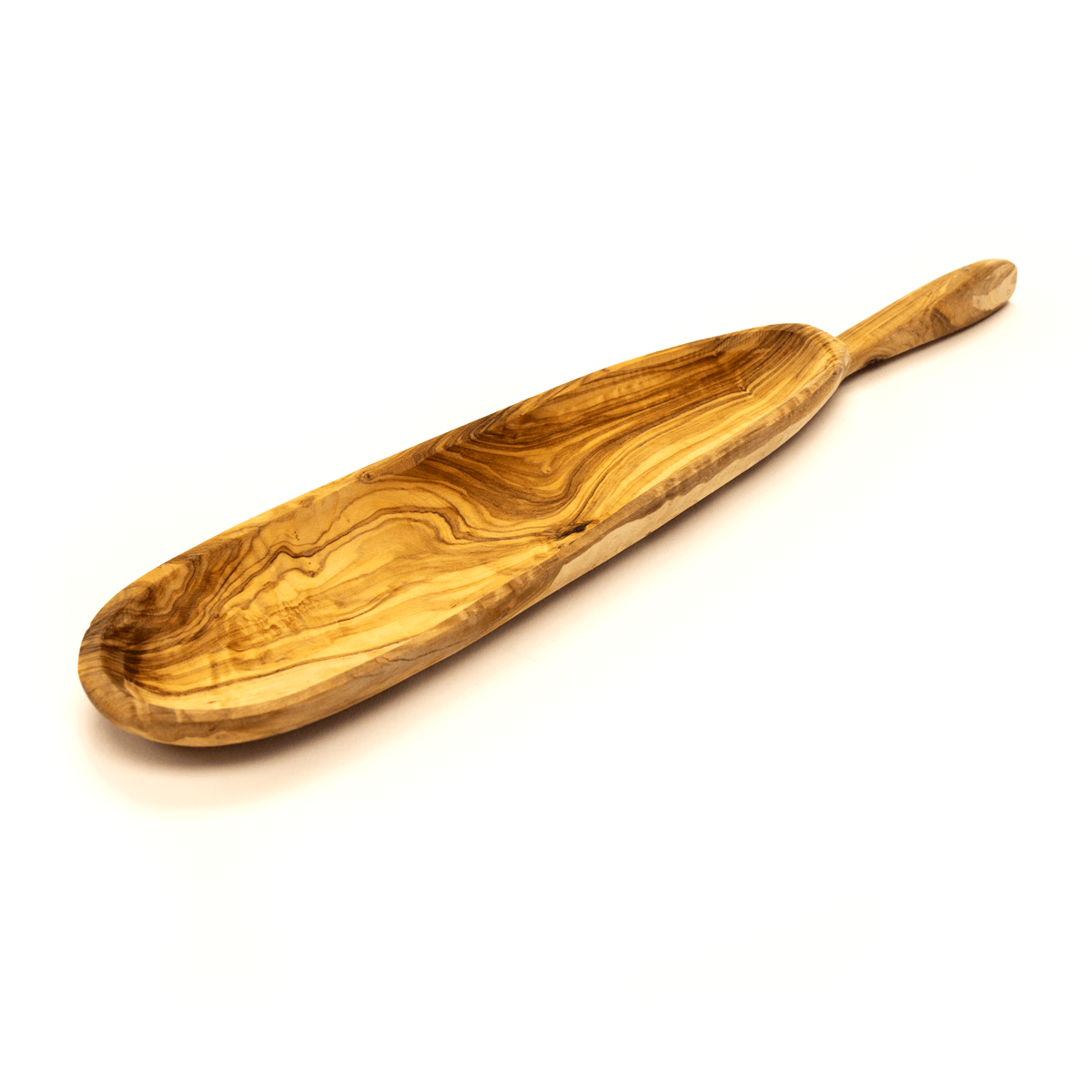Use this olive wood board to serve tapas, cheese, olives, nuts, and fruit. Cut from a block of solid olive wood, it is nonporous and seamless and won't retain any germs, stains or odors. All of our beautiful olive wood pieces are sourced from old olive trees that are no longer productive and fruitful.